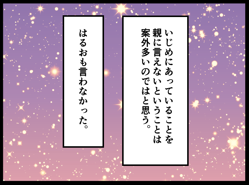 では、はるおがいじめられた時に、親に言えたかというと、言えませんでした。