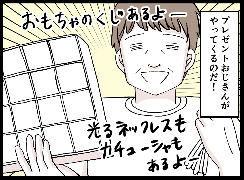 くじやおもちゃをたくさんたくさん仕込んで、現れるおじさんの正体は、実は職場で結構偉い人なのです。